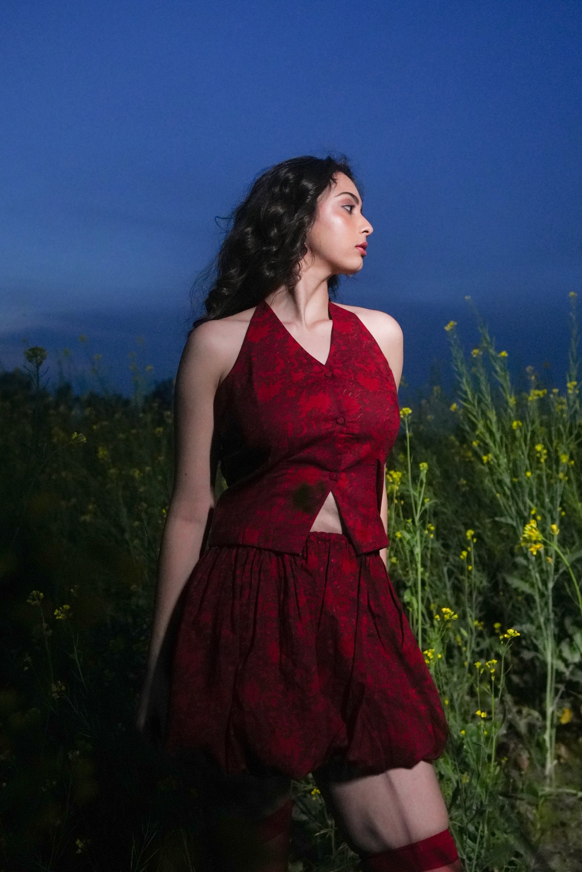 The Crim Waistcoat is a subtle statement in deep crimson, designed to feel as easy as it looks bold. A halter cut opens up the shoulders, while the front is shaped with gentle seams and an angled hem that follows the body in a relaxed, composed way. Finished with a slim button front and fine back ties, it slips seamlessly into your rotation — worn as a matching set for long, clean lines or on its own as a quietly confident top.