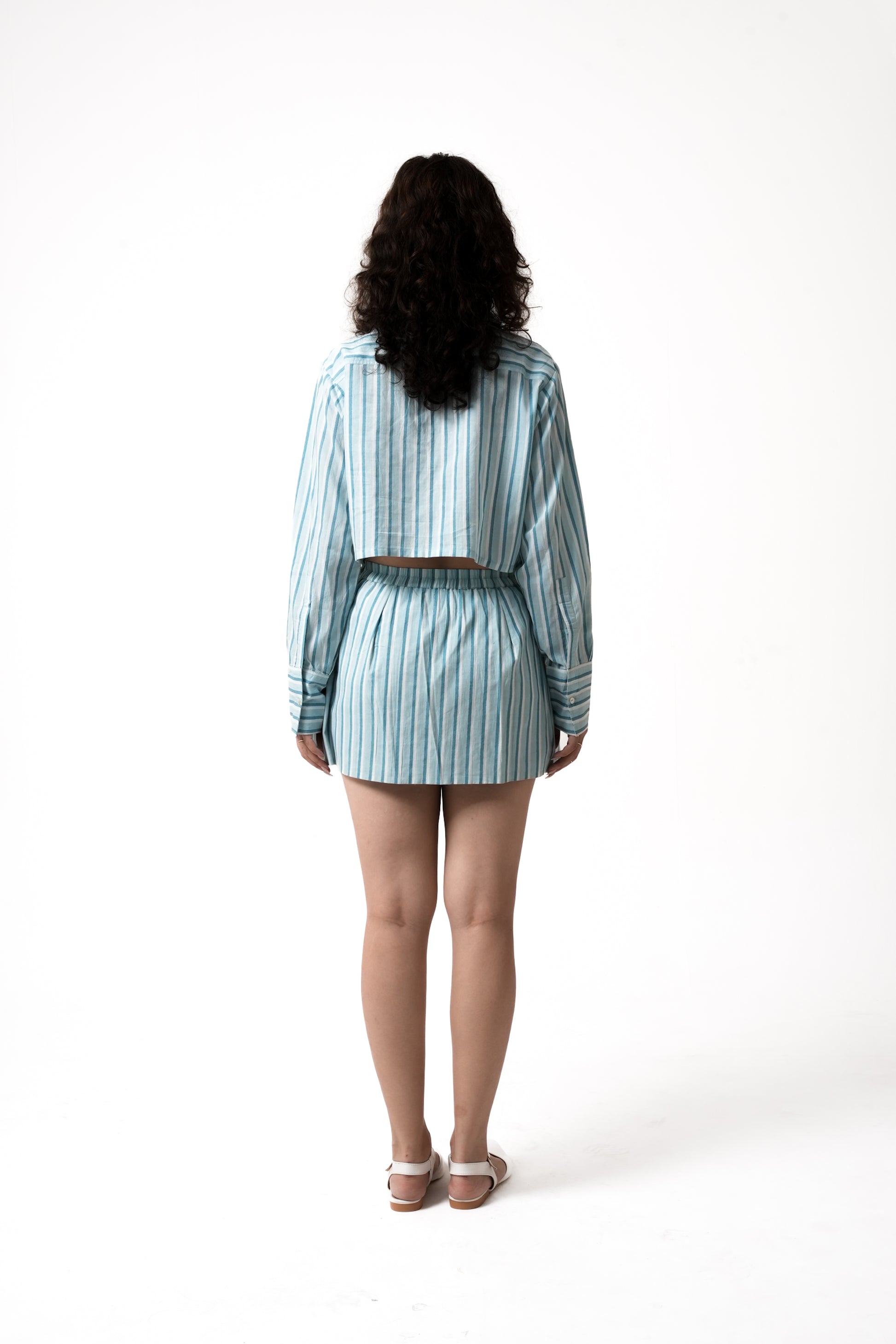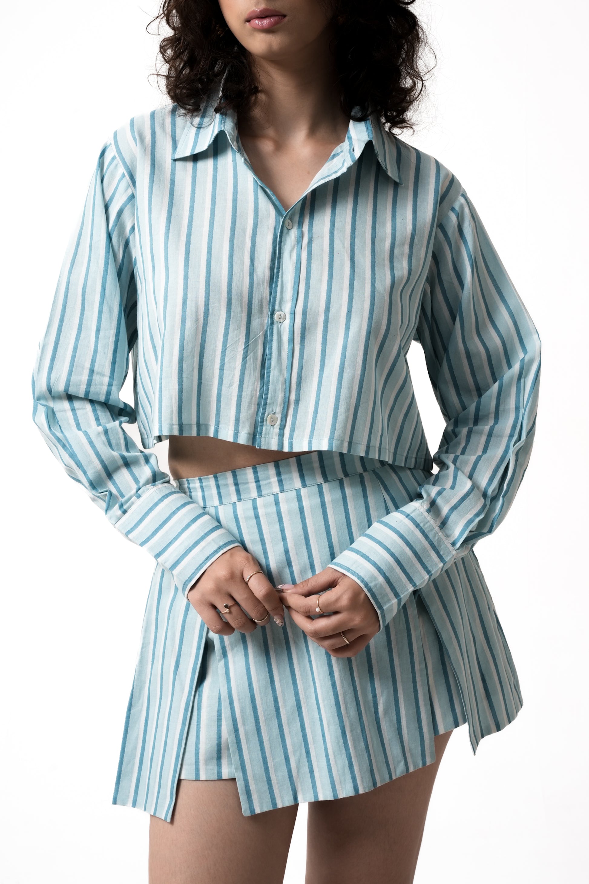 This Striped coordinated set combines timeless sophistication with a modern, fashion-forward appeal. The slightly boxy cropped button-up shirt features a structured yet relaxed fit, complete with a classic collar and long sleeves, offering a refined yet effortless look. Paired with a sleek mini skirt enhancing movement and comfort without straying from a structured, straight-cut design making it an ideal choice for both casual and semi-formal occasions. Crafted from lightweight, breathable fabric, this set delivers both style and ease of wear.