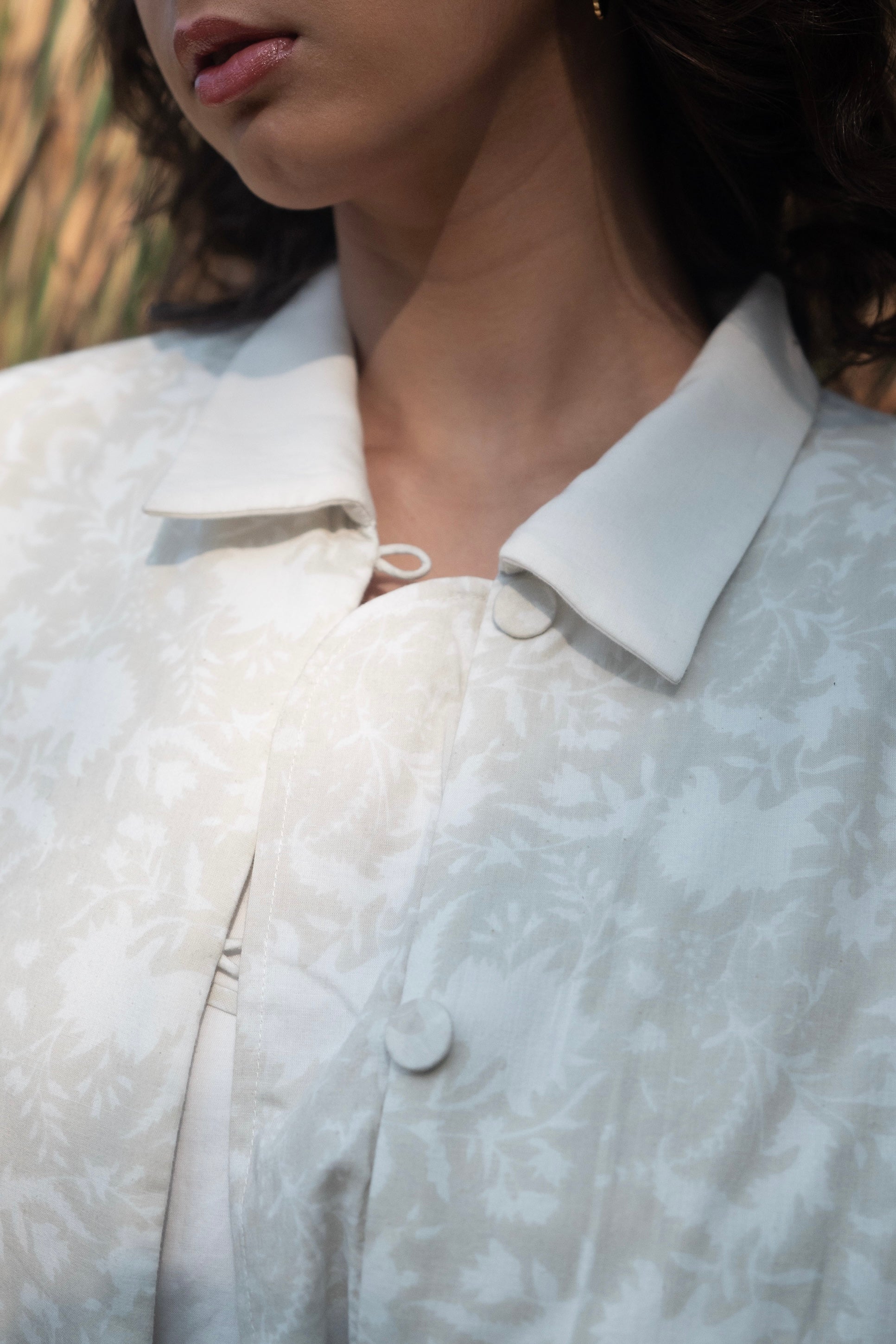 The Mohu Bomber Jacket softens the attitude of a classic bomber with a light, tonal floral that almost melts into the base. The collar, buttoned front, and gently padded body keep the shape structured yet easy, finished with elasticated cuffs and hem for a subtle cocooned feel. The inner layer is quilted with pure cotton to add warmth without bulk, making it ideal for breezy days and late evenings alike. Worn with the matching skirt or thrown over simple separates, it brings a cloud-soft layer of texture, comfort, and gentle warmth to your everyday rotation.