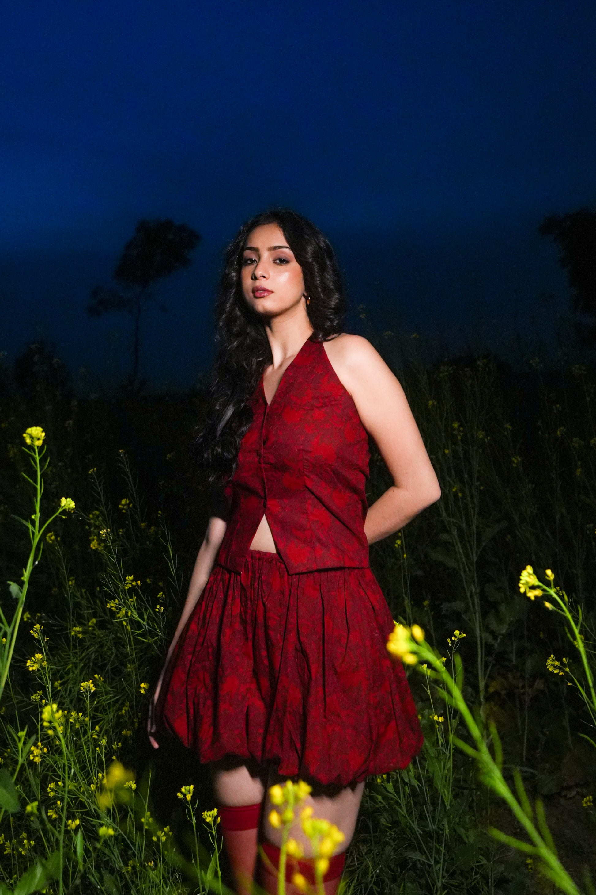 The Plume Balloon Skirt in red is all lightness and lift — a mini that floats just away from the body while keeping a clean, tailored waist. Soft gathers fall from the waistband into a rounded, cloud‑like hem, and the deep crimson floral surface adds rich yet quiet texture. It is an easy statement piece for dressing up or down.